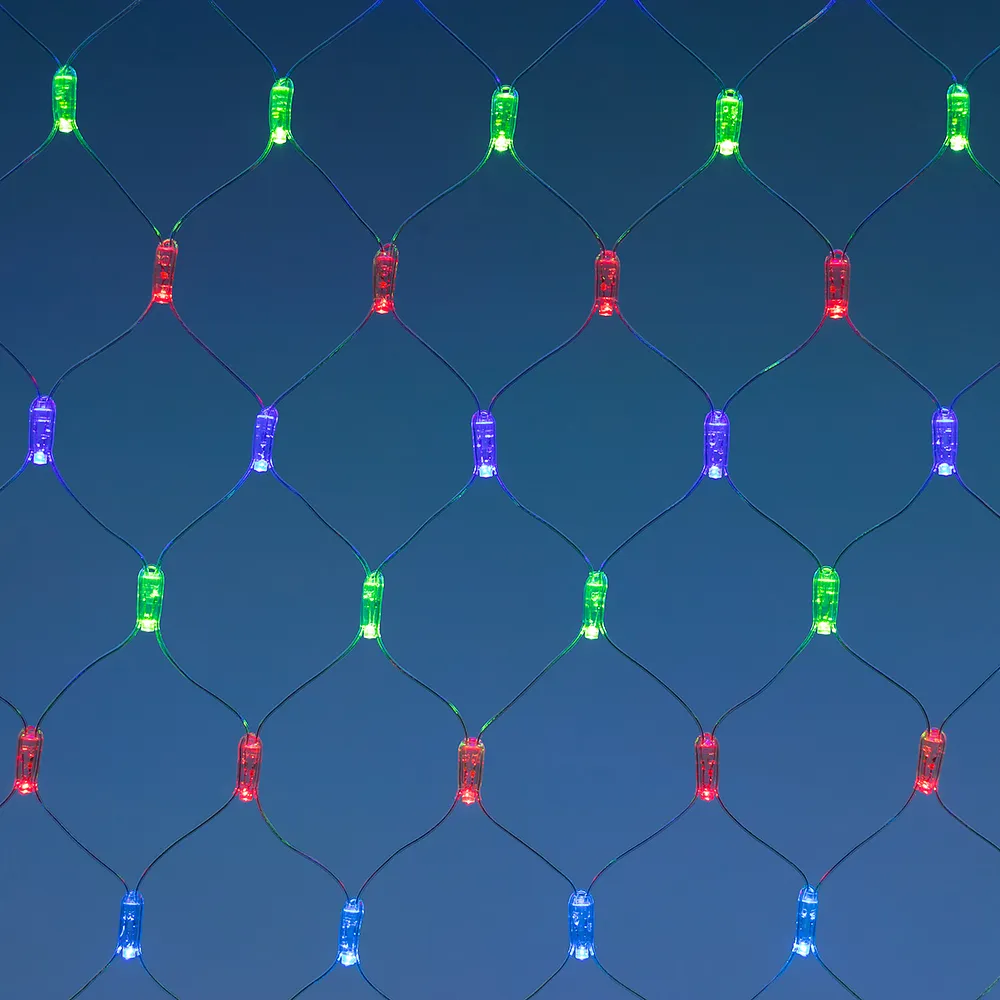 Светодиодная сеть Classic. 2000x1500 (длина 2000 мм, высота 1500 мм). Цвет свечения RGBY (светодиоды чередуются). 288 светодиодов размером 7 мм со статическим и 8 динамическими эффектами свечения с резким световым рисунком (прозрачная вогнутая линза). Провод прозрачный, ПВХ. Питание 230 В, Мощность 18 Вт,защита IP65, применение в помещении и на улице под навесом Аксессуары для подключения и выбора режима свечения в комплекте.