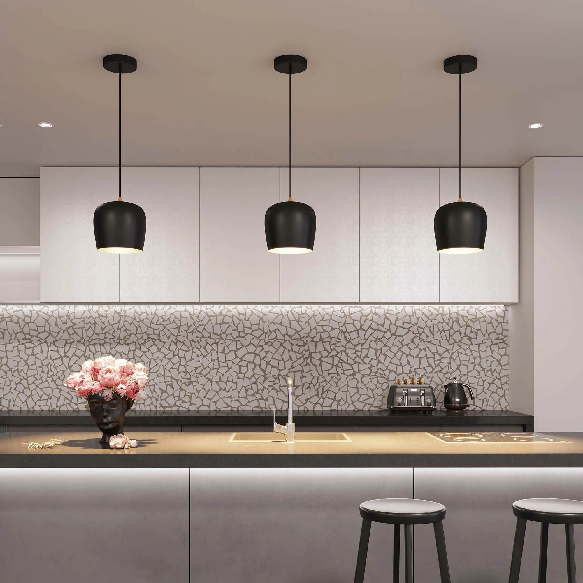 Подвесной светильник. Мощность 15 Вт, св. поток 730 лм, 50 лм/Вт, теплый 3000 K, CRI>90, угол 65°, напряжение питания 230 В. Черный круглый корпус из алюминия, степень защиты IP20. Размер: диаметр 250 мм, высота 250 мм, размер чаши: диаметр 160 мм, высота 35 мм. Монтаж подвесной, длина подвеса 1500мм. Драйвер 24-40 В, 350 мА, пульсация <5%.