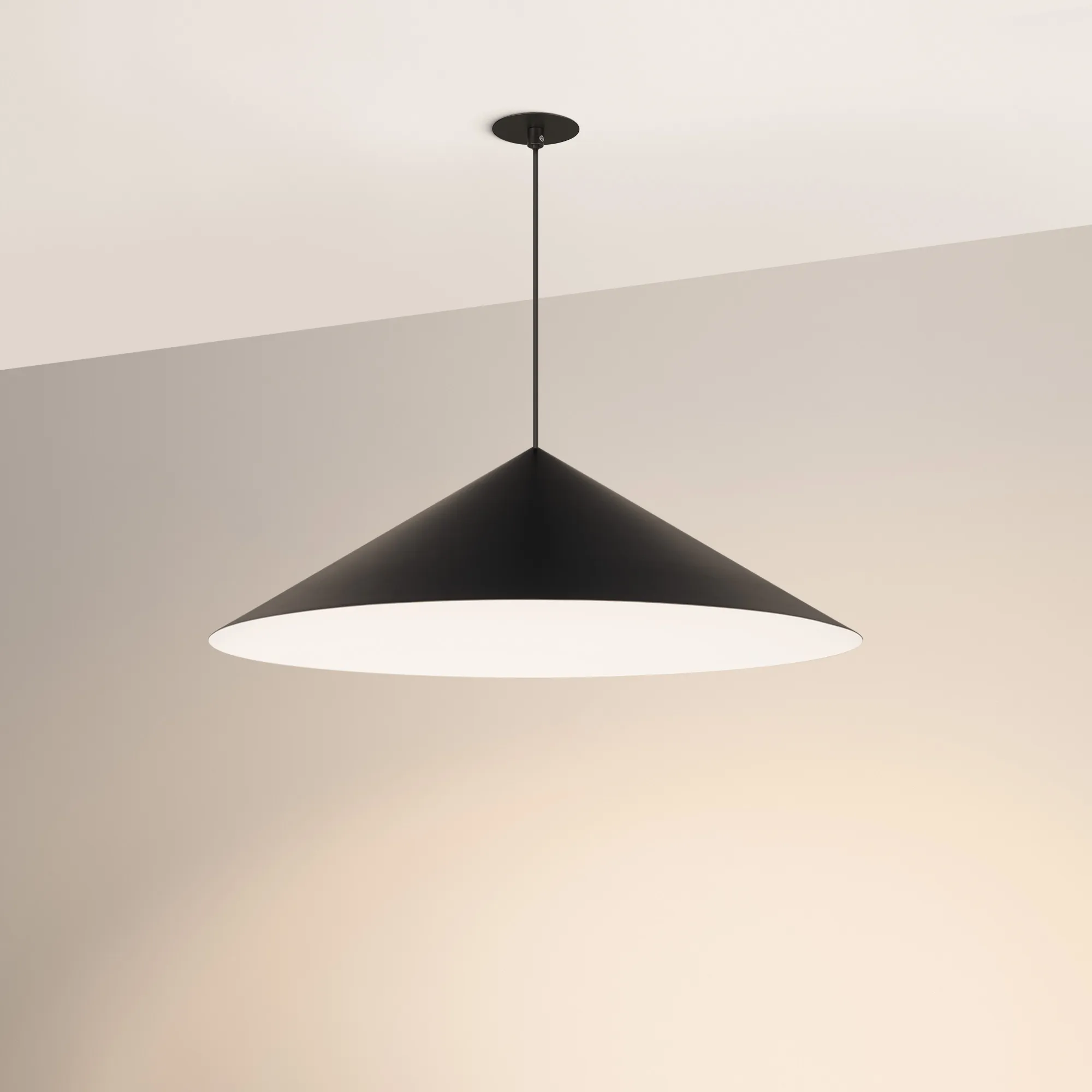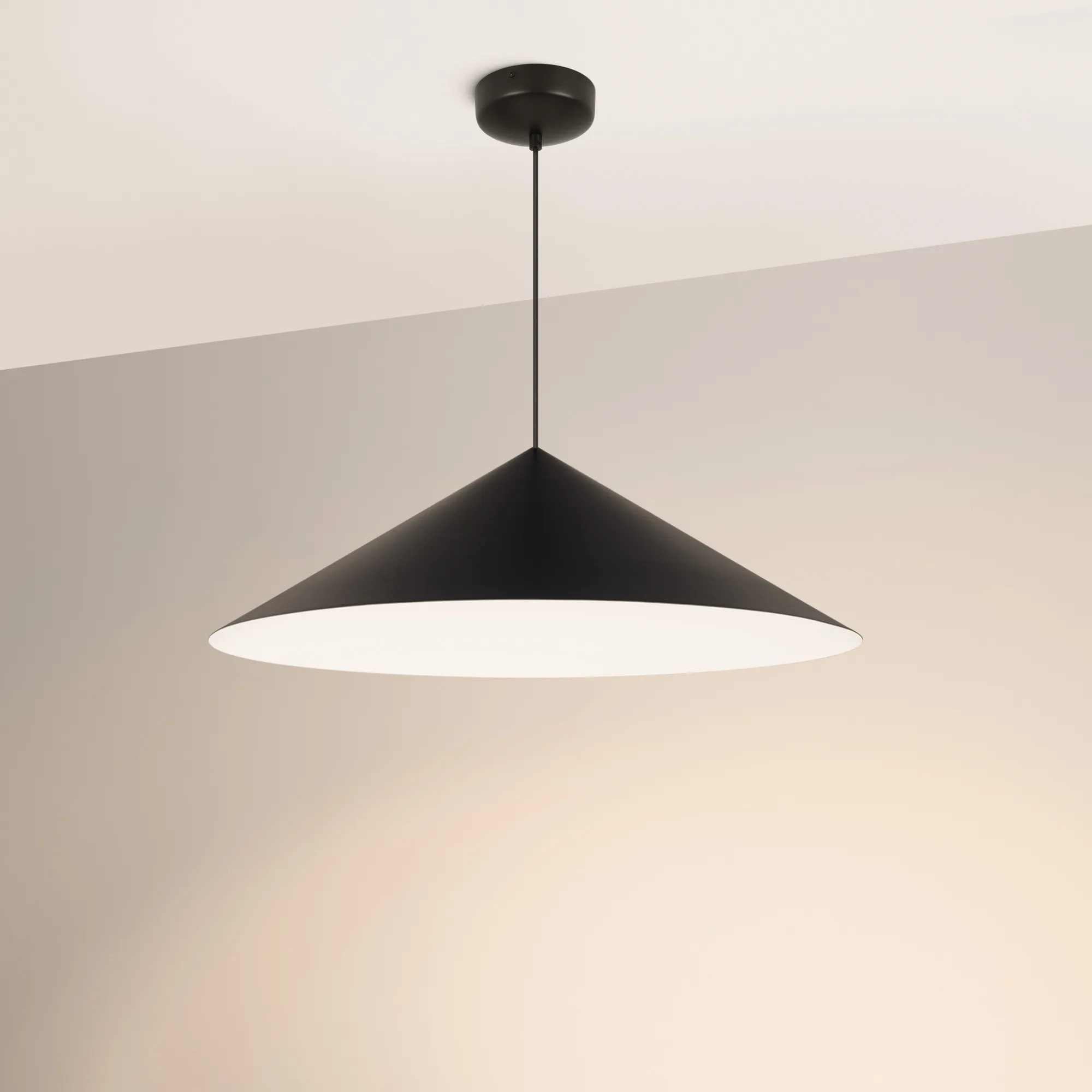 Подвесной светильник. Мощность 14 Вт, св. поток 1200 лм, 90 лм/Вт, теплый 3000 K, CRI>92, угол 36°, напряжение питания 230 В. Черный корпус из алюминия в форме конуса с белой внутренней поверхностью, линза-рассеиватель из PMMA, степень защиты IP20. Размер: диаметр 750 мм, высота 230 мм. Монтаж подвесной, длина подвеса 2000 мм, регулируемая. В комплекте 2 вида чаш. Габариты встраиваемой чаши: Ø 80x23 мм. Габариты накладной чаши Ø140x55 мм. Драйвер 27-42 В, 350 мА, пульсация <1%. Управление по TRIAC.